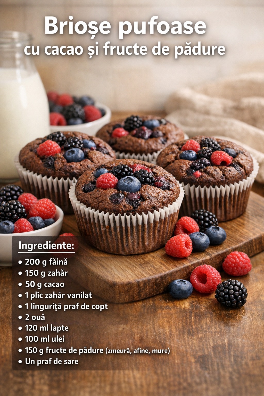 Pentru brioșe și mai pufoase, scoate ingredientele din frigider cu 15–20 de minute înainte de preparare.