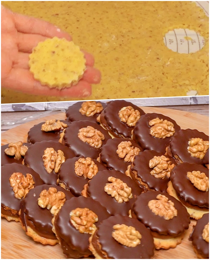 Întindem aluatul, decupăm biscuiții și îi coacem la 180°C aproximativ 10 minute. După răcire, lipim biscuiții doi câte doi cu cremă. Topim ciocolata cu uleiul, glazurăm biscuiții și așezăm deasupra câte o jumătate de nucă.