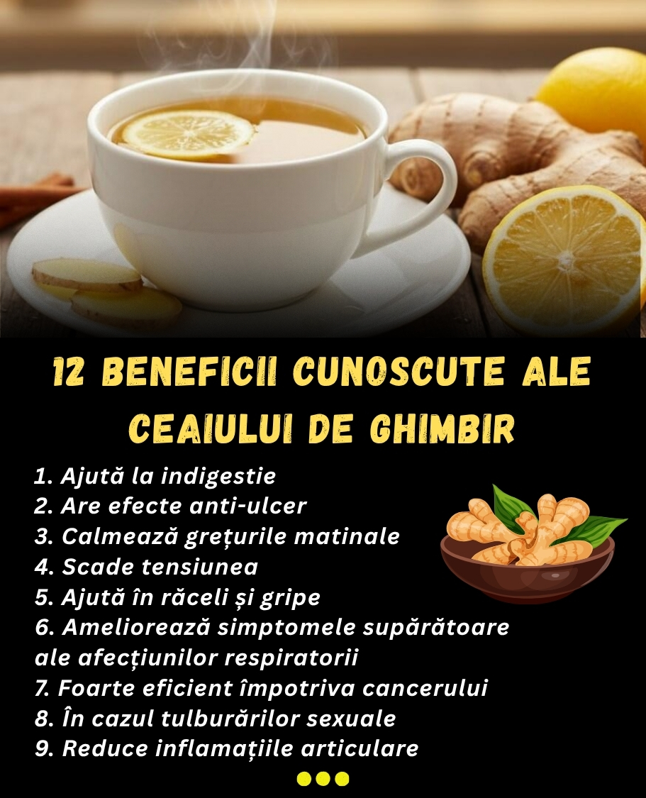 O singură cană de ceai de ghimbir pe zi, contribuie la diminuarea stresului, la combaterea problemelor respiratorii, are un efect antiinflamator și întărește imunitatea organismului nostru.