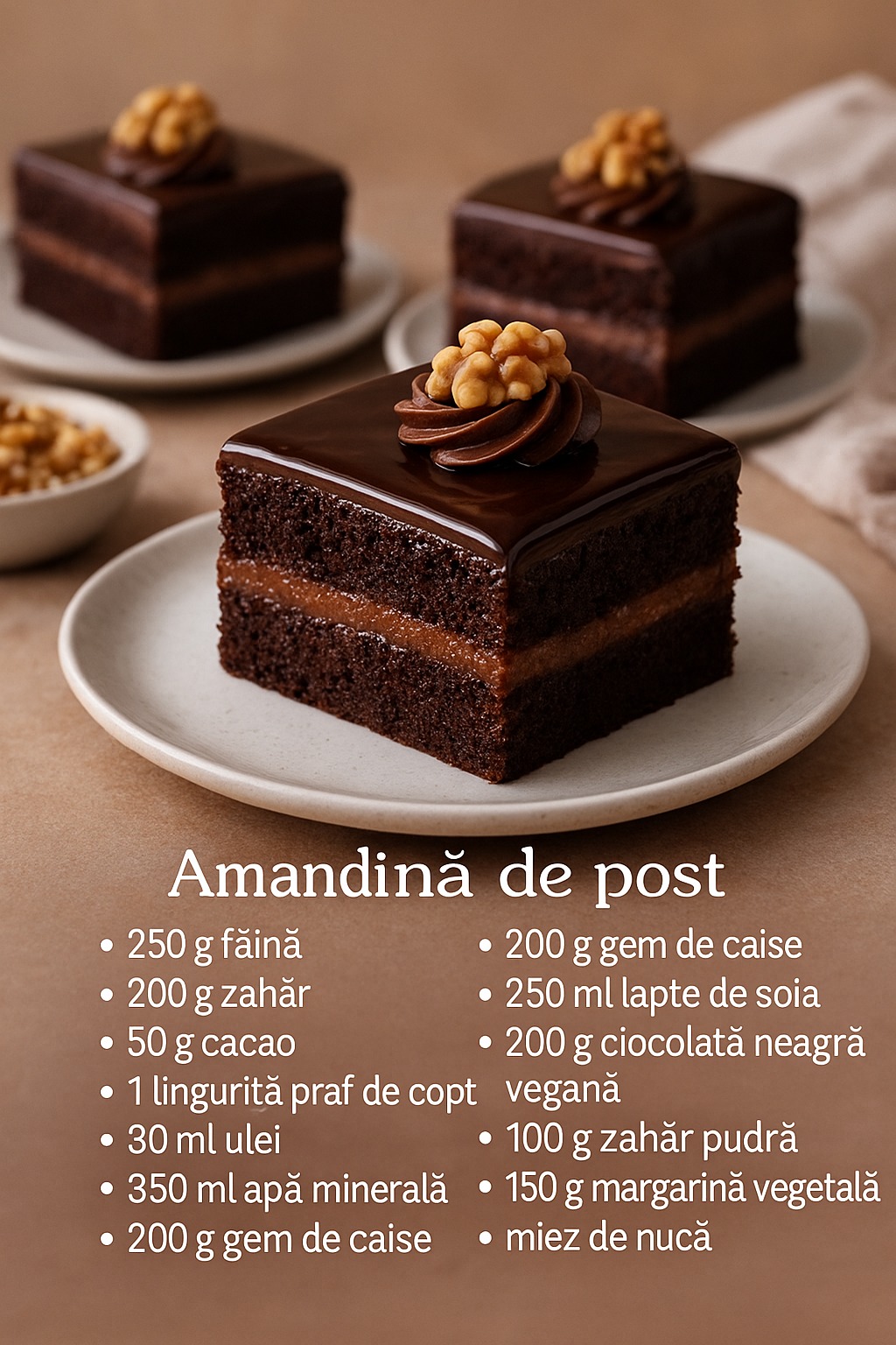 2. Pune laptele de soia într-un vas și încălzește ușor. Adaugă ciocolata și amestecă până se topește complet. Lasă să se răcească, apoi mixează cu margarina moale și zahărul pudră. La final, încorporează gemul de caise. Vei obține o cremă fină, ușor acrișoară, perfectă pentru amandine.