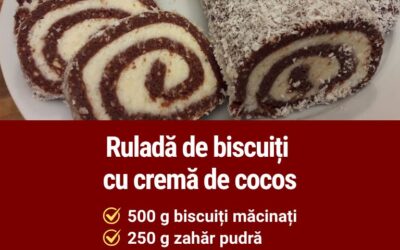 Ruladă din biscuiți cu cocos Ingrediente Ingrediente pentru compoziție:250 g zahăr pudră500 g biscuiți măcinați100 g unt moale5 lingurițe cacao30 ml esență…