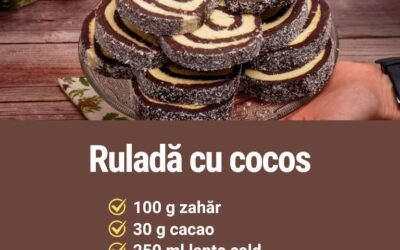 Ruladă cu cocos, fină și cremoasă INGREDIENTE Pentru foaia de biscuiți:100 g zahăr30 g cacao250 ml lapte cald125 g unt250 g biscuiți…
