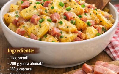Cartofi țărănești cu șuncă și cașcavalO rețetă simplă, sățioasă și extrem de gustoasă, perfectă pentru prânz sau cină! Ingrediente:• 1 kg…