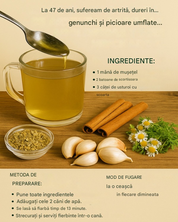 Maria, în vârstă de 40 de ani, șchiopăta din cauza artritei și se simțea frustrată. A început să bea ceai zilnic. Luni mai târziu, mergea liber, ca și cum ar dansa grațios. Studiile publicate în Journal of Ethnopharmacology sugerează că scorțișoara reduce inflamația. Fierbeți ingredientele. Aroma sa dulce revitalizează. Dar stați, următoarea este interesantă…