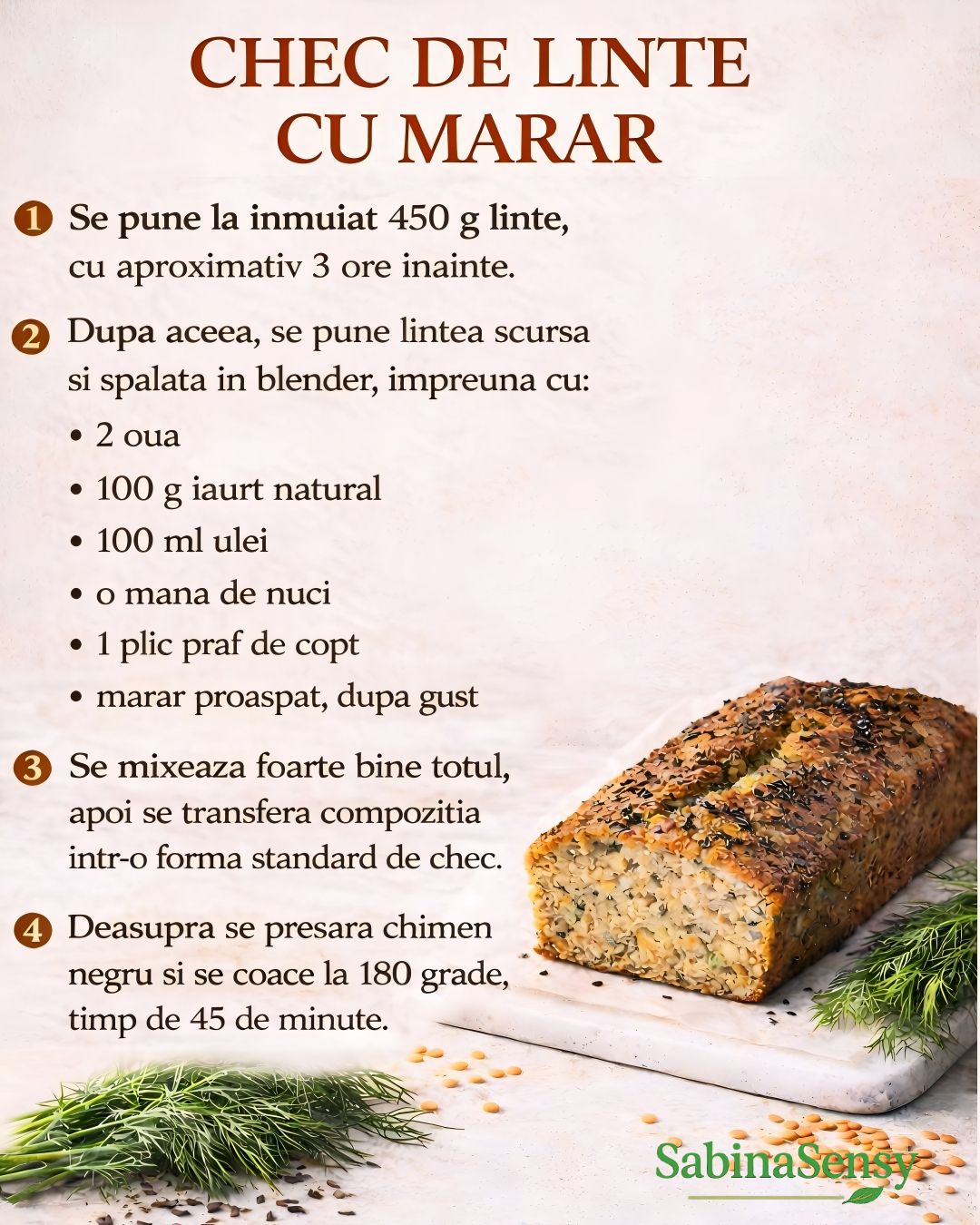 Acest chec sărat (sau "pâine de linte") nu conține făină albă, fiind ideal pentru cei care își doresc un stil de viață echilibrat. Mărarul proaspăt îi oferă o notă răcoritoare care se îmbină de minune cu gustul pământiu al lintei. 😋