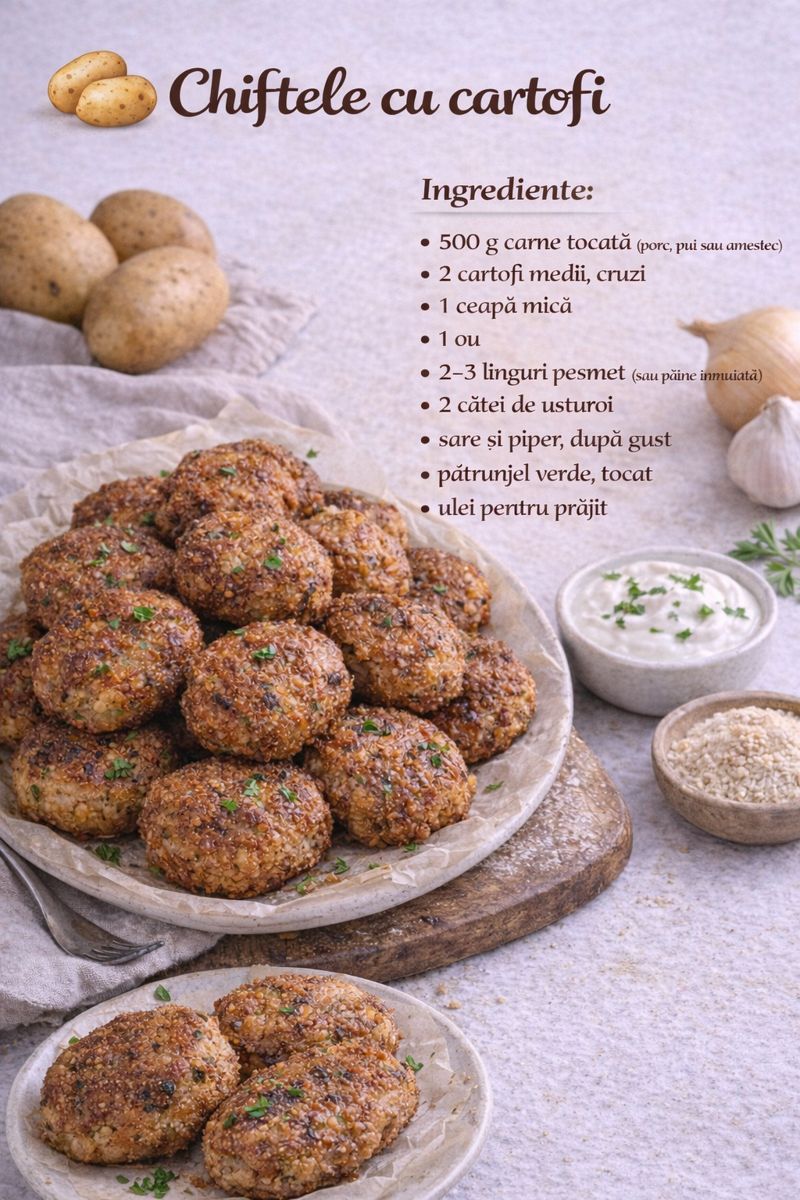 Dacă ești în căutarea unui preparat care să îți aducă aminte de gustul copilăriei, chiftelele cu cartofi sunt alegerea perfectă! Simple, economice și incredibil de gustoase, acestea pot fi servite ca gustare, fel principal lângă o salată verde sau chiar ca alternativă vegetariană la chiftelele clasice.