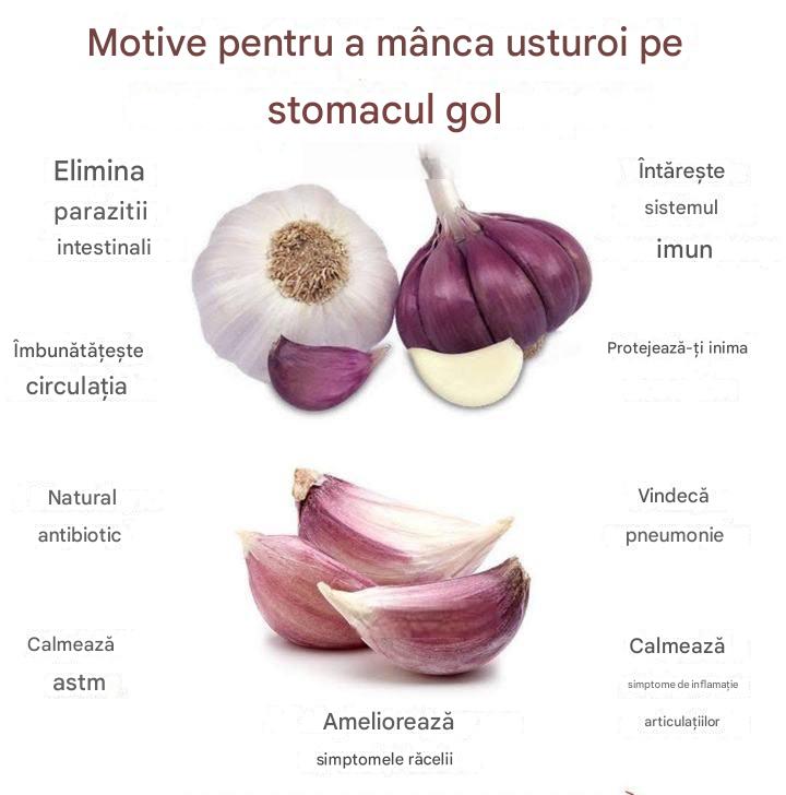 Usturoiul este unul dintre cele mai vechi și mai eficiente remedii naturale folosite în diverse culturi pentru a întări sistemul imunitar și a preveni multe boli. Dar știați că consumul de usturoi pe stomacul gol îi sporește și mai mult beneficiile? Consumul lui la această oră a zilei permite organismului să îl absoarbă mai eficient, deoarece stomacul este gol și mai receptiv la compușii săi activi.