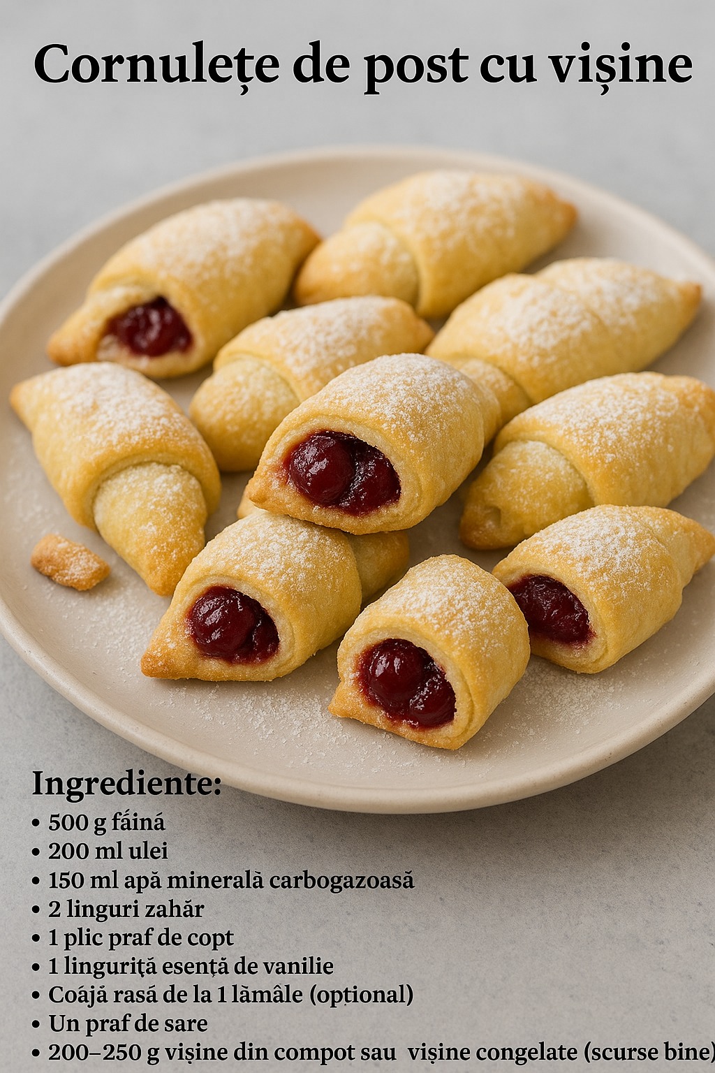 Cine spune că deserturile de post nu pot fi spectaculoase? Astăzi vă propunem o rețetă care va dărâma acest mit: cornulețe de post cu vișine. Sunt atât de fragede încât se topesc în gură, iar combinația dintre aluatul fin și gustul acrișor al vișinelor este absolut divină! ✨