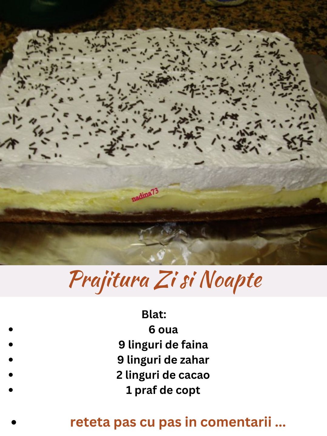 Prăjitura "Zi și Noapte" este un desert clasic și iubit, prezent în caietele de rețete ale bunicilor noastre. Numele său sugestiv provine de la contrastul vizual delicios dintre blatul pufos cu vanilie (ziua) și cel intens cu cacao (noaptea), adesea unite printr-o umplutură simplă și o glazură lucioasă. Este o prăjitură spornică, ieftină și ușor de făcut, perfectă pentru orice ocazie, de la o masă de duminică la o sărbătoare în familie.