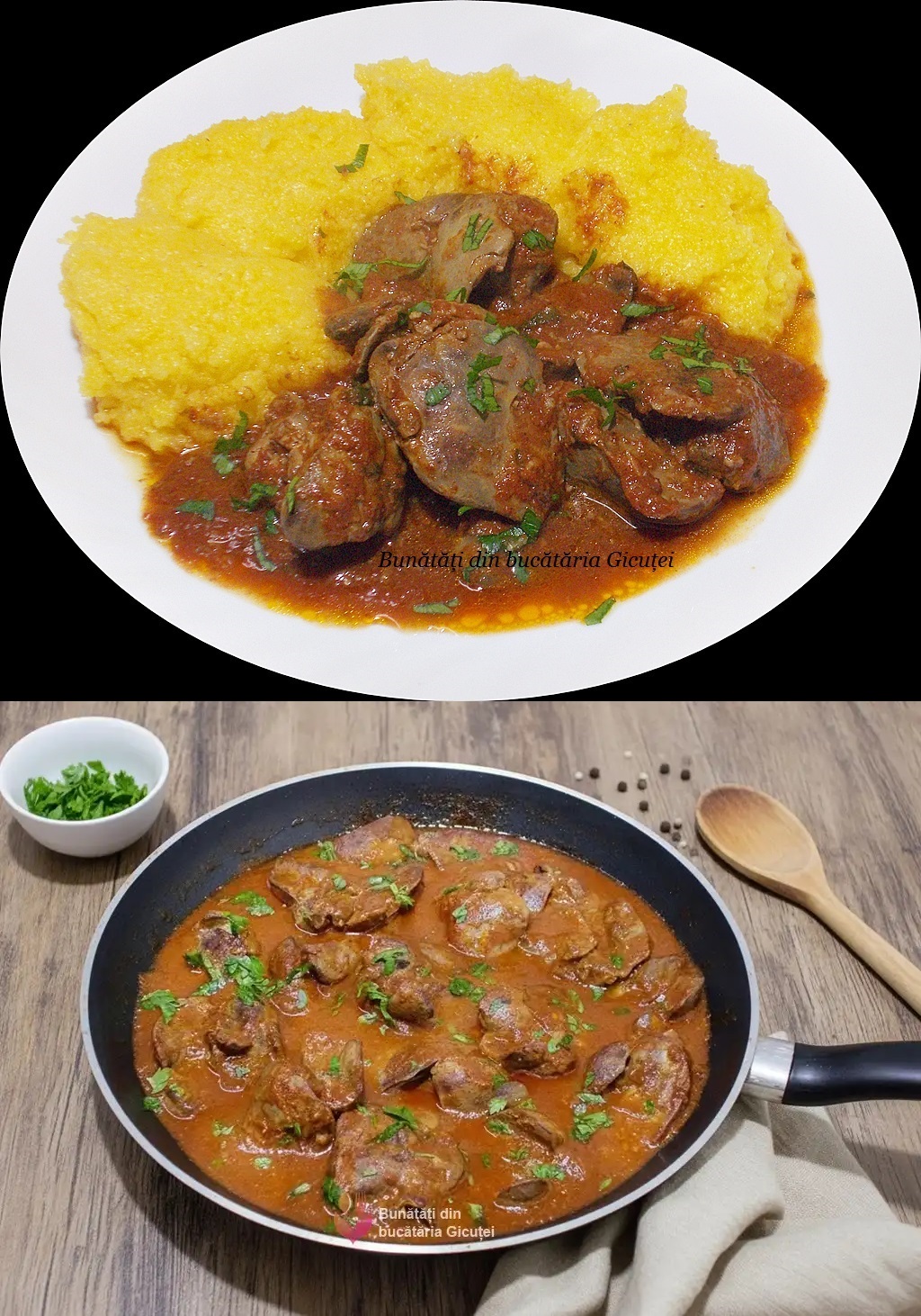 Secretul acestei rețete stă în textura ficățeilor: trebuie să fie cremoși la interior, nu uscați, scăldați într-un sos de roșii bogat și bine usturoiat.