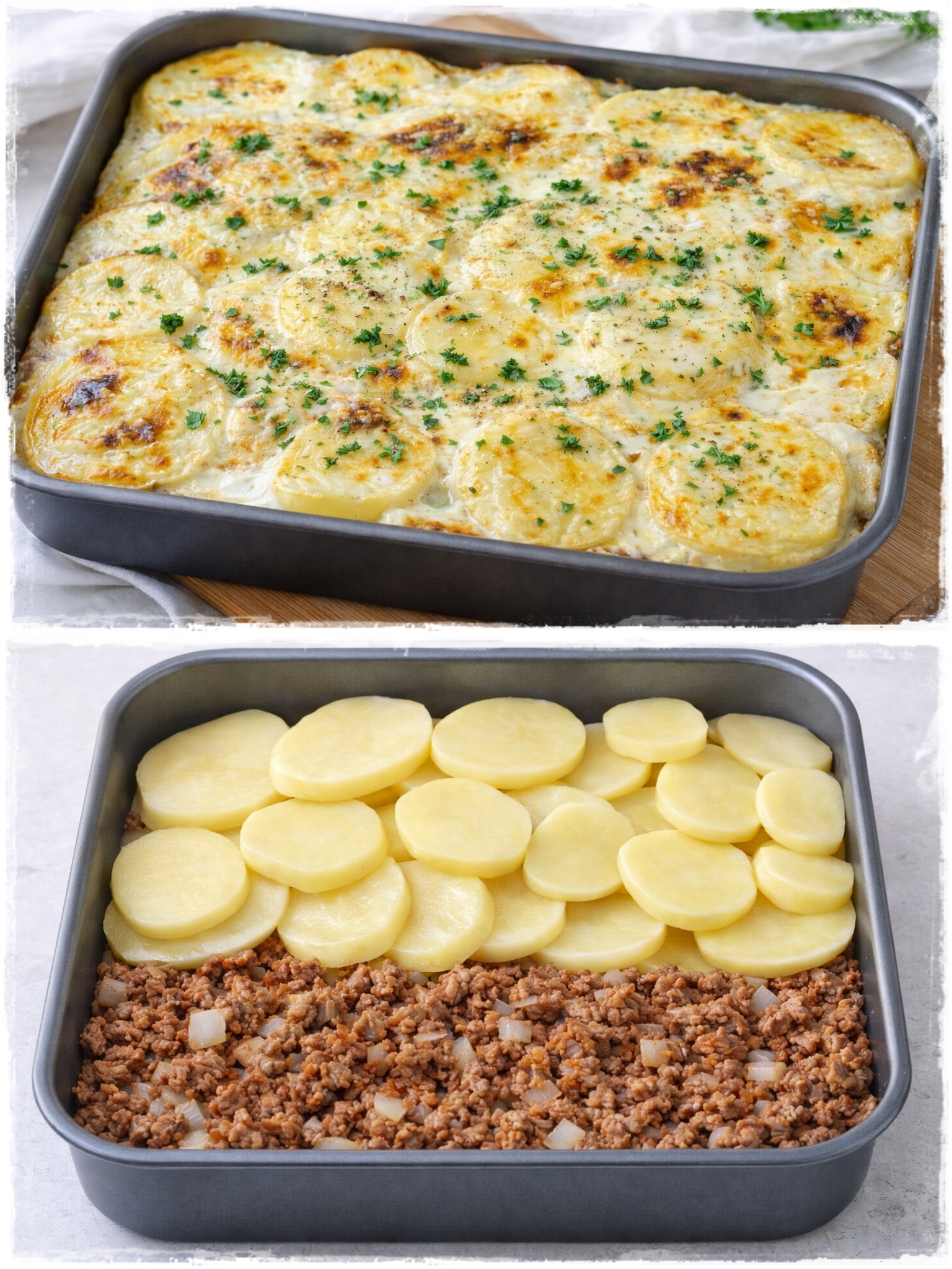 Există puține mâncăruri care să ofere atâta confort precum o tavă de musaca de cartofi abia scoasă din cuptor. Stratificată, suculentă și acoperită cu o crustă aurie de smântână și ou, această rețetă este definiția prânzului perfect în familie. 😋