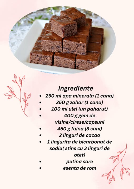 Pont: Folosirea gemului de prune sau de vișine (mai acrișor) ajută la obținerea unui blat mai fraged și completează excelent gustul de cacao. Apa minerală asigură o textură mai pufoasă și aerată.