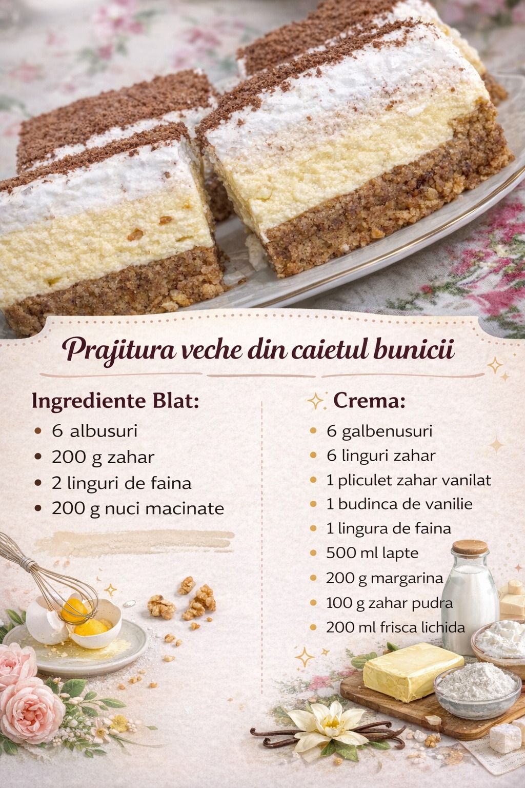 1. Bateti 6 albusuri intr-o spuma tare, adaugati zahar, nucile macinate si faina.