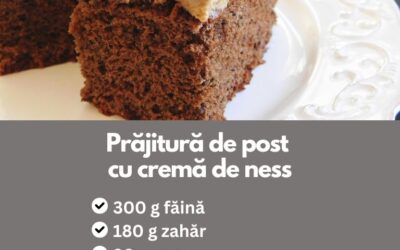 Prăjitură de post cu cremă de ness REȚETA Ingrediente pentru blat:300 g făină180 g zahăr30 g cacao1 plic praf de copt (10…