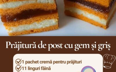 Prăjitură de post cu gem și griș INGREDIENTE Ingrediente necesare pentru foi:11 linguri de făină11 linguri de ulei11 linguri de zahăr11 linguri…