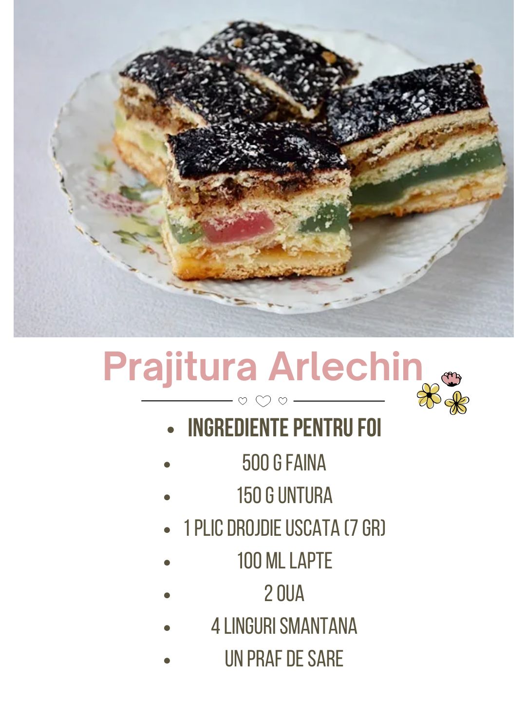 Prăjitura Arlechin este un desert clasic românesc, care impresionează nu doar prin gustul său bogat și echilibrat, ci și prin aspectul festiv, dat de straturile sale colorate și diverse. Cu foi fragede, un strat dulce-acrișor de gem, bucățele de rahat colorat și o bezea pufoasă cu nucă, această prăjitură este perfectă pentru a aduce o notă de eleganță și savoare oricărui eveniment, de la mesele în familie la ocaziile speciale.
