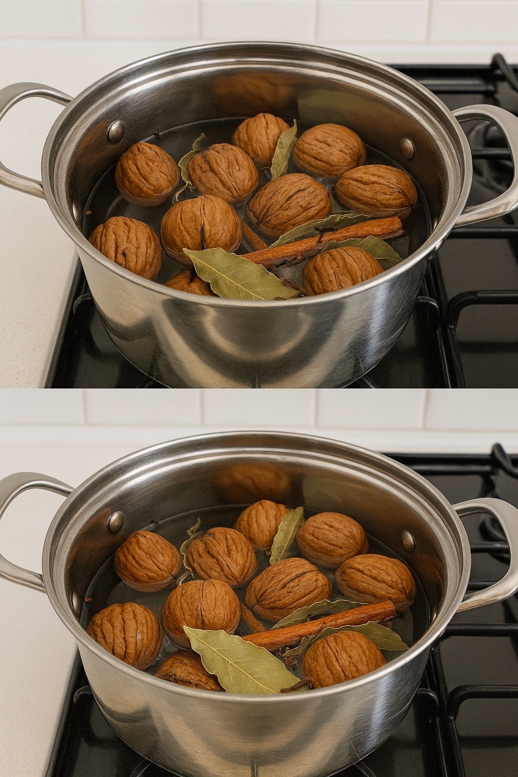 Metoda naturală Inițial, luăm o cratiță cu apă și o lăsăm să fiarbă cu nucile înăuntru timp de câteva minute, apoi adăugăm câteva foi de dafin și puțină scorțișoară. Când totul începe să fiarbă, adăugăm o lingură de oțet de mere și continuăm să fierbem amestecul încă câteva minute, apoi oprim focul și lăsăm să se răcească.
