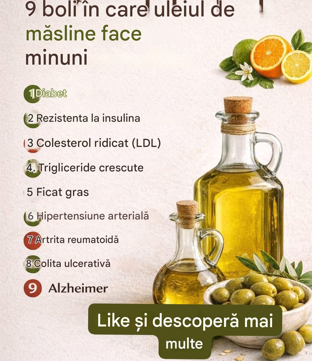Uleiul de măsline ajută, de asemenea, la menținerea unor niveluri sănătoase de colesterol HDL și poate reduce riscul de boli de inimă. Lămâile pot scădea tensiunea arterială și pot crește nivelul de colesterol HDL bun, conform articolului din 2010, „25 de beneficii pentru sănătate ale lămâilor”, scris de LiJingMing.