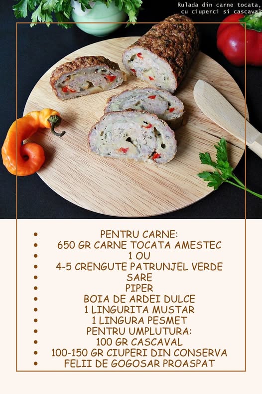 🥘 Ruladă din carne tocată cu ciuperci și cașcaval – Aperitivul perfect pentru mese festive