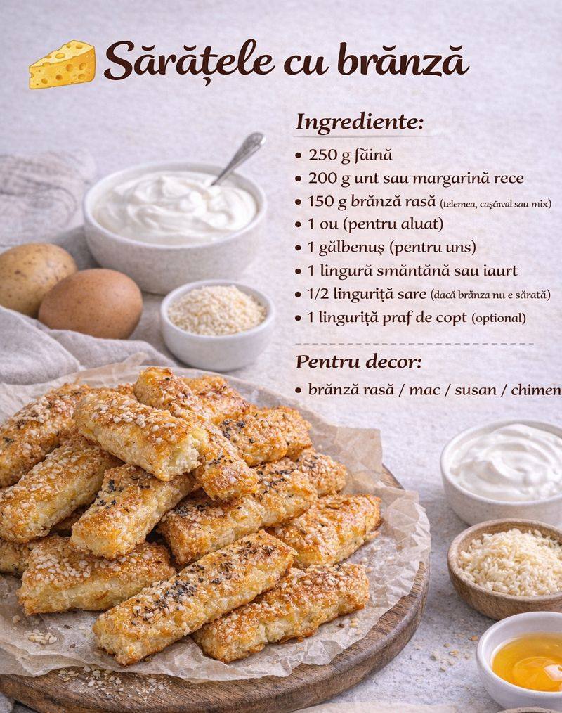 Dacă există un miros care să ne amintească instantaneu de bucătăria bunicii, acela este parfumul de sărățele proaspăt scoase din cuptor. Aurii, crocante la exterior și incredibil de fragede în interior, sărățelele cu brânză sunt vedetele oricărei mese festive sau pur și simplu companionul perfect pentru o cană de ceai ori un pahar de vin. 🍷