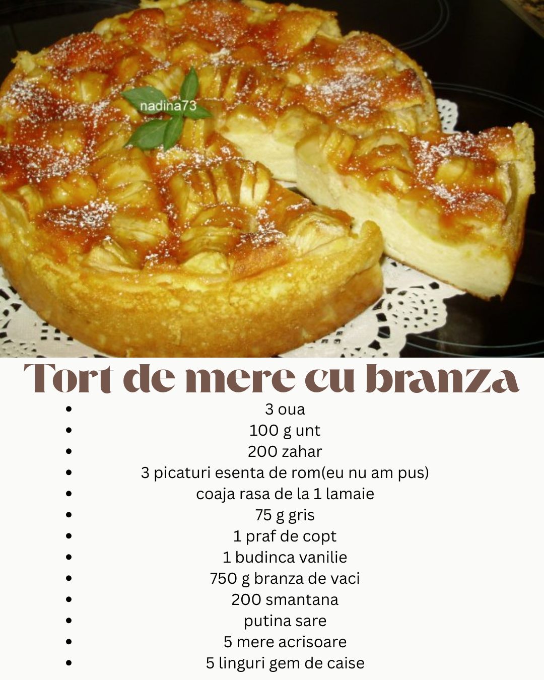 Această rețetă este împărțită în trei etape: Blatul (Baza), Umplutura de Brânză și Umplutura de Mere.