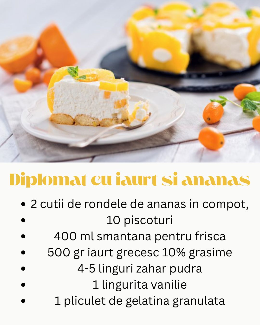 Tortul Diplomat este un desert clasic, iubit pentru textura sa fină și gustul său răcoritor. Rețeta pe care v-o propunem astăzi aduce o notă proaspătă și lejeră prin includerea iaurtului și a ananasului zemos. Este un tort fără coacere, gata rapid și ideal pentru zilele călduroase sau pentru când doriți un desert spectaculos, dar simplu de preparat.