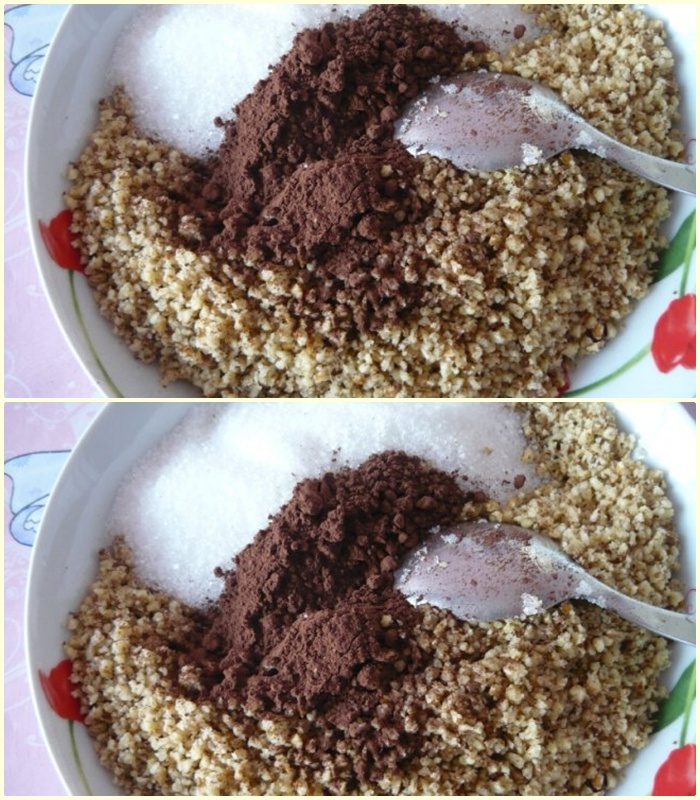 Amestecați uscat: Într-un bol, combinați nuca măcinată cu zahărul, cacaua și praful de sare. Amestecați bine până când cacaua este uniform distribuită.